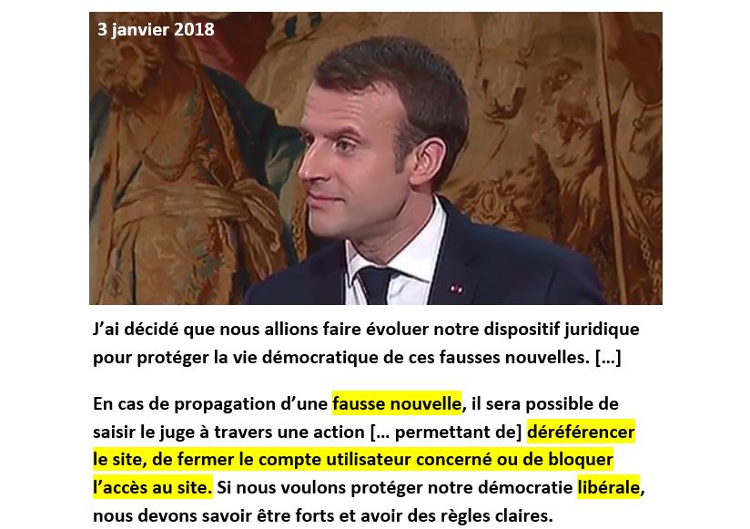 NDL : on est en plein "Patriot act" à l'américaine, ou comme en 2002, les USA se sont doté de lois qui ont permis une chasse aux sorcières, ou même des américains innocents ont été mis en cause, par simple délation, et ont pour beaucoup, perdus emplois et situations.Incroyable : Macron emboîte le pas à la Chine et à l'Iran en matière de liberté d'expression en ligne, en proposant tout simplement de fermer les comptes utilisateurs et les sites Internet en cas de diffusion de "fausses informations". pic.twitter.com/gOqcTtP2aE— Olivier Berruyer (@OBerruyer) January 3, 2018