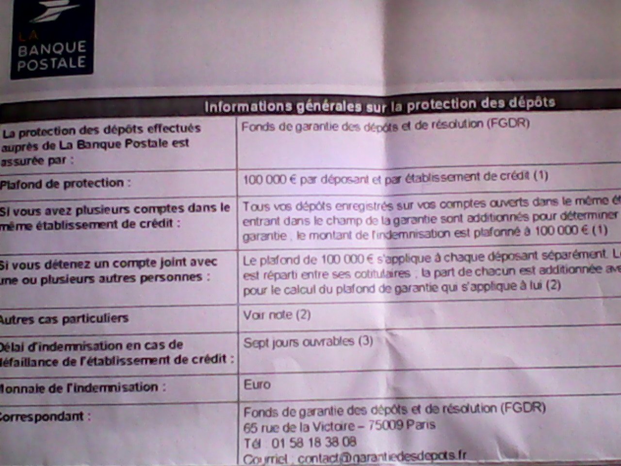 T'es à La Banque Postale, t'as plus de 100 000 euro sur tes comptes ? T'as reçus ta petite feuille qui t'expliques que si la Banque Postal fait faillite, tu ne récupérera que 100 000 euro, et c'est tout ! Et encore, estime toi heureux, car le gouvernement peu très bien réduire ce plafond s'il est invité a mettre la main à la poche, dans le cas d'un renflouement.....