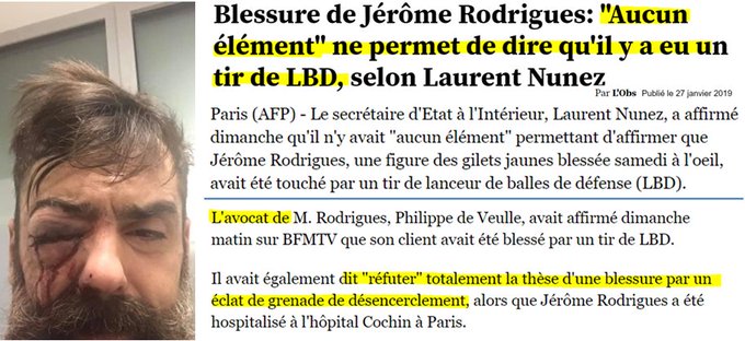 ⚡️JEROME RODRIGUEZ - CHOC 💥 / Figure du mouvement des #GiletsJaunes, il a été touché par un tir de #FlashBall dans l’œil droit lors de l’#ActeXI des #GiletsJaunes pic.twitter.com/0qsiOuWJFr— Pure. (@PureTele) January 26, 2019
