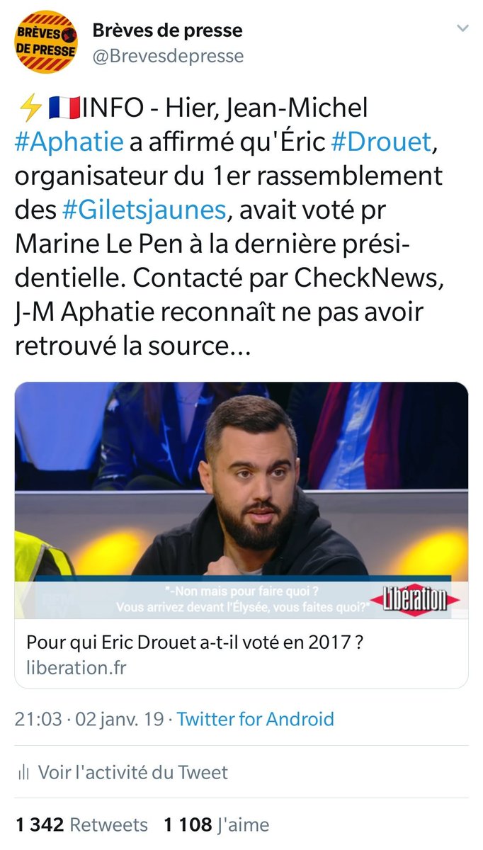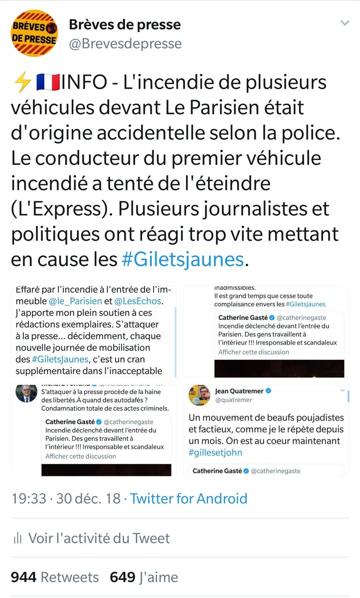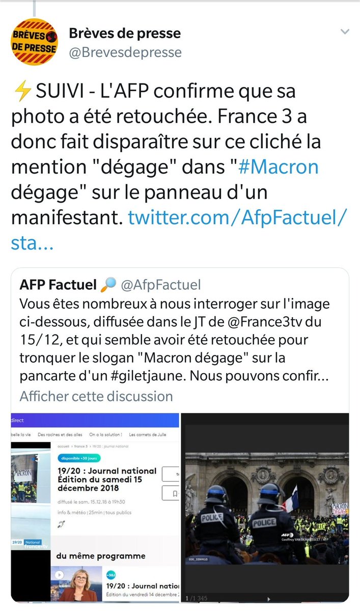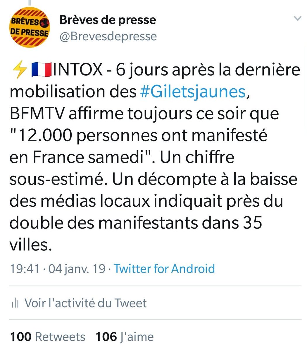 Jamais les médias français ont été autant manipulateurs et partisans depuis le début du mouvement des gilets jaunes. Même encore aujourd'hui, devant la flagrance de leurs désinformations, ils continuent a mentir, a orienté les débats, et a passer outre leurs décrédibilisations vis à vis du peuple qui pourtant, a lancer clairement une défiance a leurs manques de pluralités et d'éthiques. Ce qui évidemment font les choux gras des sources d'informations alternatives, que ces même médias accusent de complotismes et d'être de foyers d'extrêmes droites.
