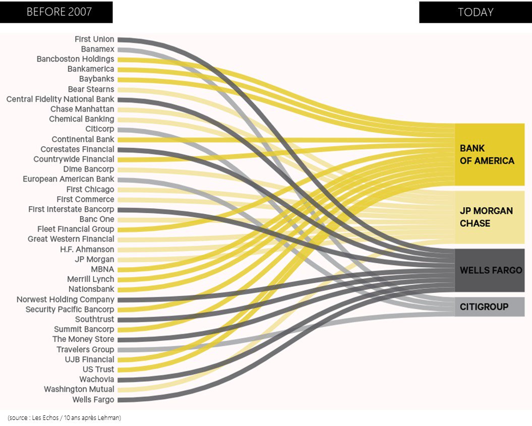 Exemple de ce qui ce passe en Europe. Les gros qui mangent des petits pour continuer a exister, spéculer, tricher a grande échelle. En 10 ans, le nombre de banques aux USA a été réduit des deux tiers, et celles subsistantes aujourd'hui, sont quasiment toute tributaire de prestataire en liens avec ces grosses banques.