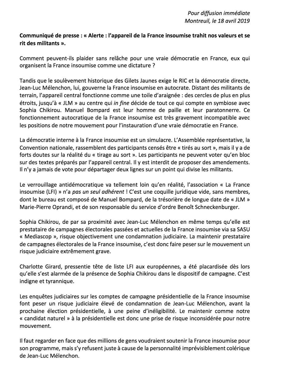 Thomas Guénolé accuse les dirigeants de LFI de faire pression sur lui pour qu’il retire « spontanément » sa candidature à l’élection européenne. Il dénonce un « verrouillage antidémocratique » du mouvement. (communiqué).