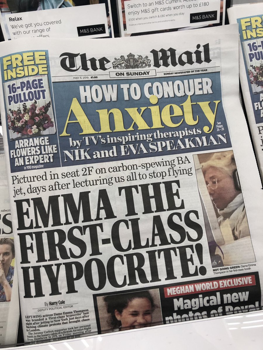 Emma Thompson manifestaient à Londres en disant à la plèbe de ne pas prendre l’avion pour sauver la planète. Quelques jours plus tard, la voici en First; siège 2F. Ces réchauffistes veulent vous ramener au Moyen Age parce qu’ils vous considèrent comme inférieurs !