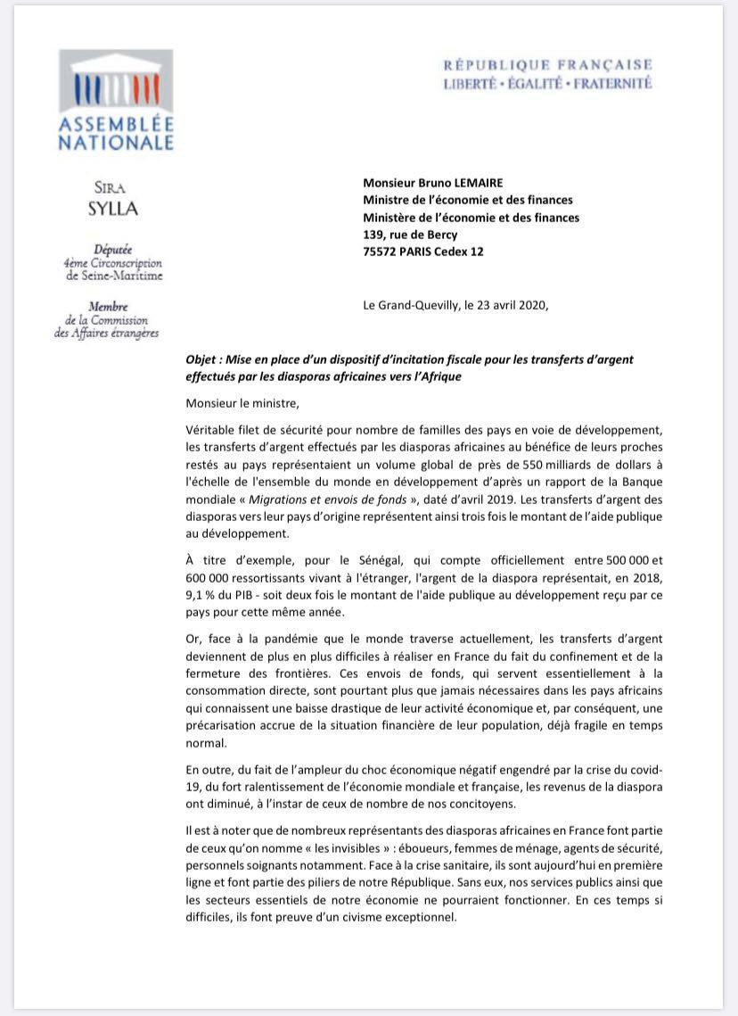 Pour ceux qui n'ont pas le temps de lire le document, il s'agit d'une demande la défiscalisation pour les transferts de fonds de la diaspora africaine en France vers l’Afrique. En gros, la possibilité de pouvoir aidé financièrement des gens qui en partie, vivent du commerce parallèle, qu'on appel plus communément "au noir".