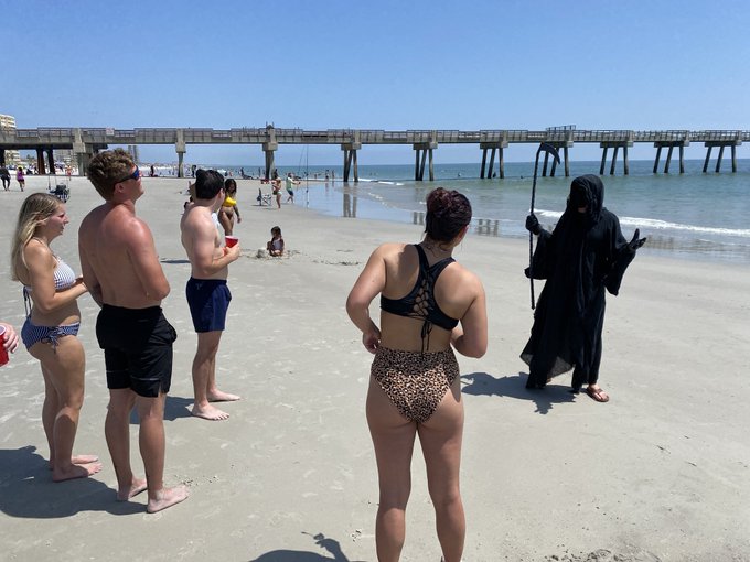 Sur la plage de Jacksonville en Floride, un individu a voulu sensibiliser les plagistes sur le respect des règles sanitaires. Non sans humour, il sera néanmoins pris à parti par un supporter de Trump qui l'accusera de jouer le jeu de Biden et des démocrates de vouloir tuer la liberté...... la police interviendra pour calmer l'individu.