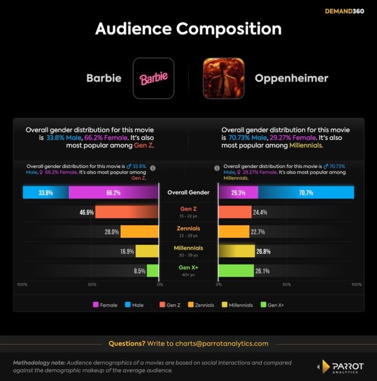 Pas de surprise, Barbie à attiré une clientèle plutôt jeune et féminine, alors qu'Oppenheimer, un spectateur plus adulte majoritairement masculin.