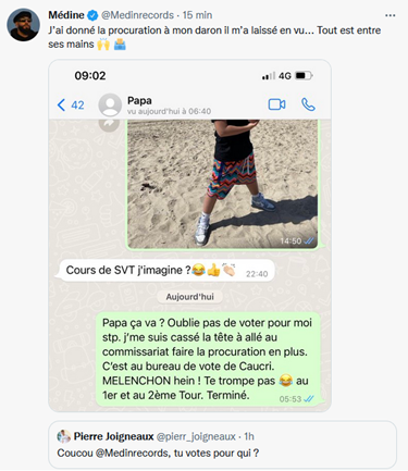 «MÉLENCHON hein ! Te trompes pas. Au 1er et au 2ème tour. Terminé». En avril 2022, à deux jours du premier tour de l’élection présidentielle, le rappeur Médine poste sur les réseaux sociaux ce message envoyé à son père, à qui il a donné sa procuration. Le message est clair : il invite sans détour à voter pour le candidat insoumis. Au second tour, le chanteur appellera à voter Macron, pour faire «barrage à l'extrême droite». Dans le milieu du rap, généralement loin du jeu des partis, cet engagement politique fait figure d'exception.