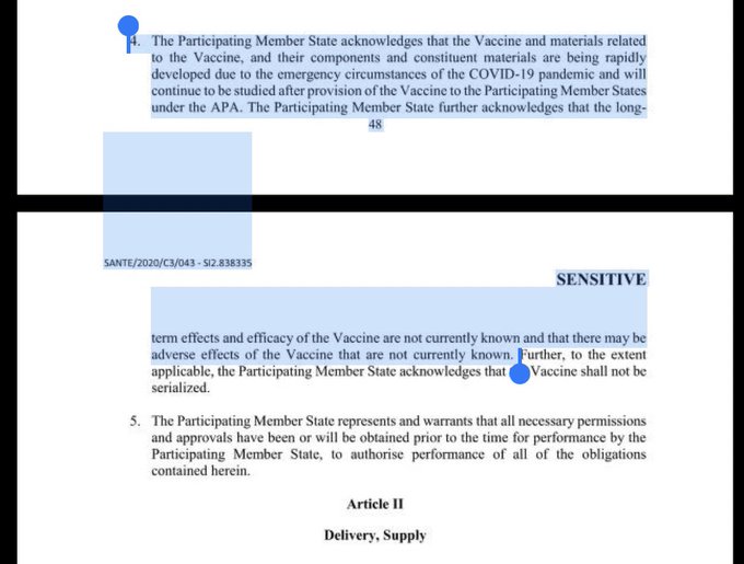 « L'État membre participant reconnaît que le vaccin et les matériaux liés au vaccin, ainsi que leurs composants et matériaux constitutifs, sont rapidement développés en raison des circonstances d'urgence de la pandémie de COVID-19 et continueront à être étudiés après la fourniture du vaccin à l'État membre participant. L'État membre participant reconnaît en outre que les effets à terme et l'efficacité du vaccin ne sont pas actuellement connus et qu'il pourrait y avoir des effets indésirables du vaccin qui ne sont pas actuellement connus. » !