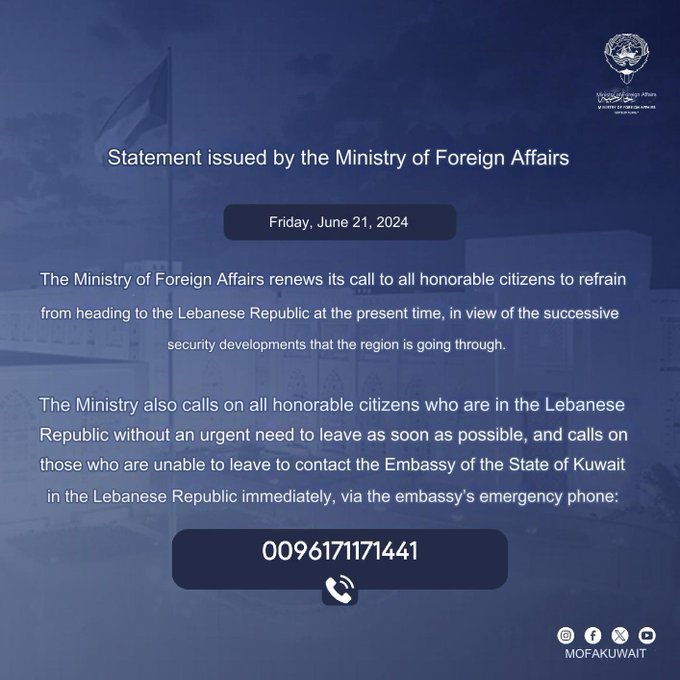 Il semblerait qu'Israël remonte des troupes et du matériel de la bande de Gaza jusqu'au Nord du pays, à la frontière libanaise, pour combattre le Hezbollah. Une invasion terrestre du Sud Liban serait une question de jours, il faut s'attendre à ce qu'Israël aille même plus loin. Il y a de plus en plus de signes qu'une guerre est imminente : le Koweït demande à ses citoyens de quitter le pays dans les meilleurs délais (photo), le Canada s'apprêterait à rapatrier 40 000 personnes... L'administration de Biden serait consternée et impuissante. Une nouvelle guerre provoquerait des milliers de morts et plongerait le Liban, déjà considérablement fragilisé, dans une crise importante qui durerait des années. Au vu des relations historiques entre la France et le Liban, notre Ministère des Affaires Étrangères peut déjà se préparer à une cellule de crise si jamais Israël dépasse le simple combat contre le Hezbollah et se lance dans l'invasion terrestre de son voisin. La crise au Proche-Orient n'est pas près de s'arrêter.