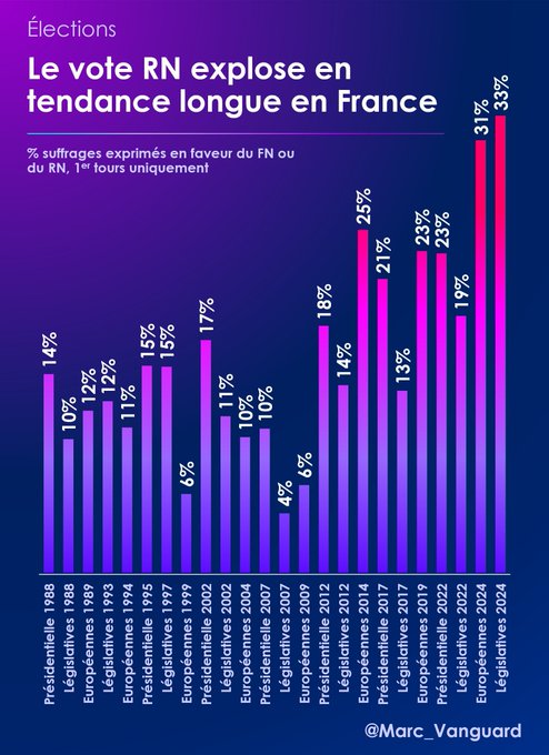 Sans surprise, Marine LePen est condamné à 5 ans d'inéligibilité. Elle ne pourra donc pas servir d'antagonisme au second tour au candidat choisit par le système. Il y a donc une option que ce soit Mélenchon mais ça va être très très très compliqué de le faire monter au podium. Car Bardella n'a pas le charisme pour remplacer Marine.