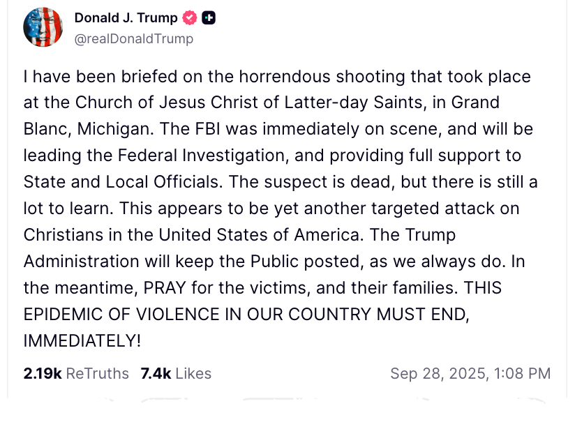 J'ai été informé de la terrible fusillade survenue à l'Église de Jésus-Christ des Saints des Derniers Jours, à Grand Blanc, dans le Michigan. Le FBI est immédiatement intervenu et mènera l'enquête fédérale, apportant son soutien total aux autorités locales et étatiques. Le suspect est mort, mais il reste encore beaucoup à apprendre. Il semble qu'il s'agisse d'une nouvelle attaque ciblée contre des chrétiens aux États-Unis. L'administration Trump tiendra le public informé, comme toujours. En attendant, prions pour les victimes et leurs familles. Cette épidémie de violence dans notre pays doit cesser IMMÉDIATEMENT !