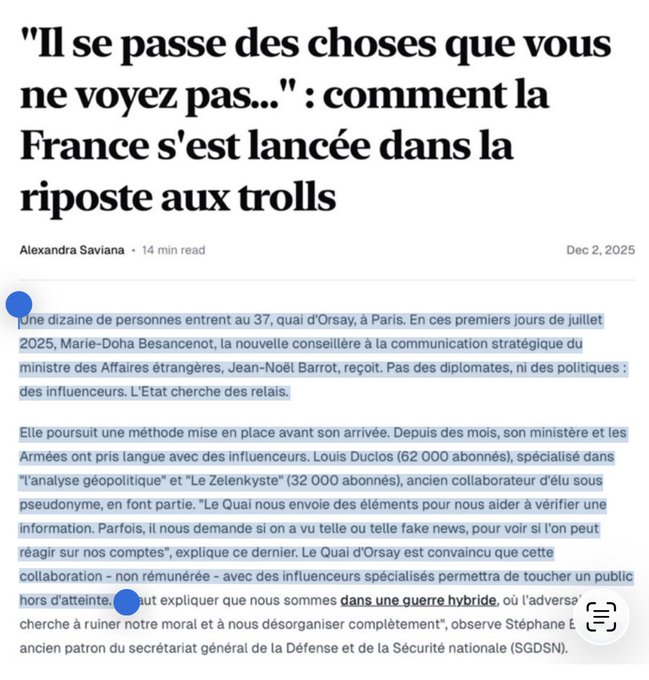 L’Express révèle quelque chose de fondamental : des comptes sur X qui harcèlent, diffament et insultent des opposants politiques, voire demandent leur incarcération, sont en fait missionnés directement par le ministère des Affaires étrangères et le ministère des Armées, qui leur fournissent même « des éléments » ! Dans le cadre d’une « collaboration » car « l’État cherche des relais » (sic).